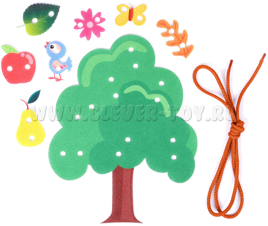 Шнуровки различного типа давно и успешно используются педагогами и родителями для раннего развития детей. Дерево из фетра поможет сделать это развитие интересным и весёлым. Благодаря листикам, фруктам, цветочкам, птичкам, которые крепятся к фетровому дереву, малыш научится шнуровать, завязывать узелки и бантики.