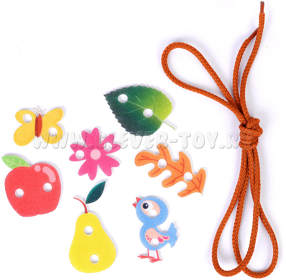 • 8 игровых элементов из фетра – яблоко, груша, бабочка, дубовый листочек, берёзовый листочек, цветочек, птичка;