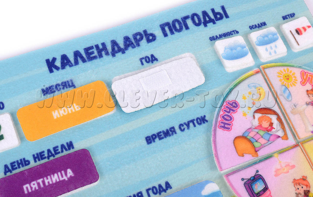 Научить ребенка пользоваться календарем – задача непростая, но важная. В этом родителям поможет мягкий конструктор «Календарь погоды» – яркое и наглядное учебное пособие, с которым изучать времена года станет проще и интереснее. Регулярные занятия с аппликацией помогут малышу освоить календарь, сформировать привычку жить по режиму и планировать свое время.