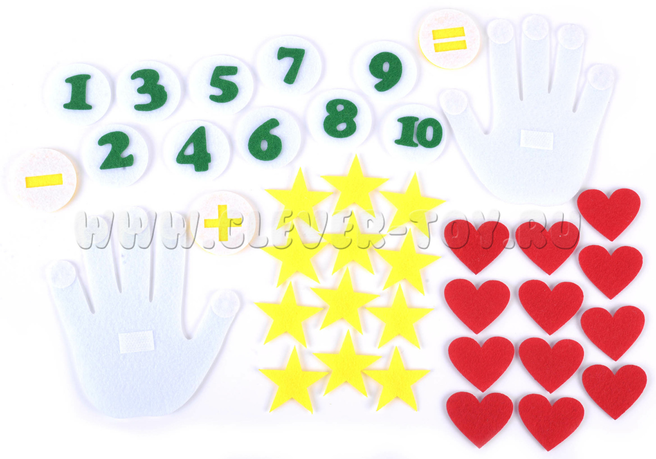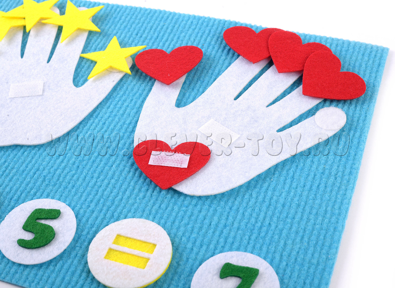 • Набор из 40 фигурок (ладошки с липучками на пальцах и ладонях, звездочки, сердечки, цифры, знаки),