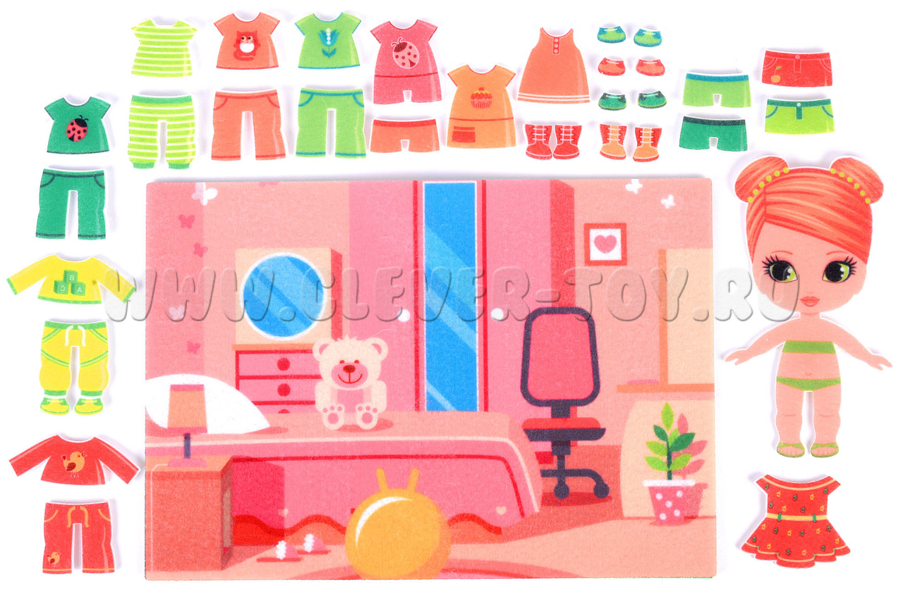 25 предметов одежды и обуви. Яркие, разноцветные, имеют многоразовые липучки и легко крепятся на фигурку девочки. Вся одежда прорисована до мельчайших деталей, включая украшения, картинки и шнурки на ботиночках.