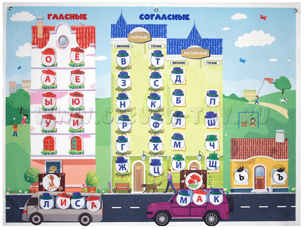 В комплекте вы найдёте красочное панно размером 60×80 см с изображением трёх домиков в городе букв. Также есть игровые элементы в форме кружочков с красными и синими буквами, игровые элементы в виде машин и автобуса, а также фигурки дидактических картинок.