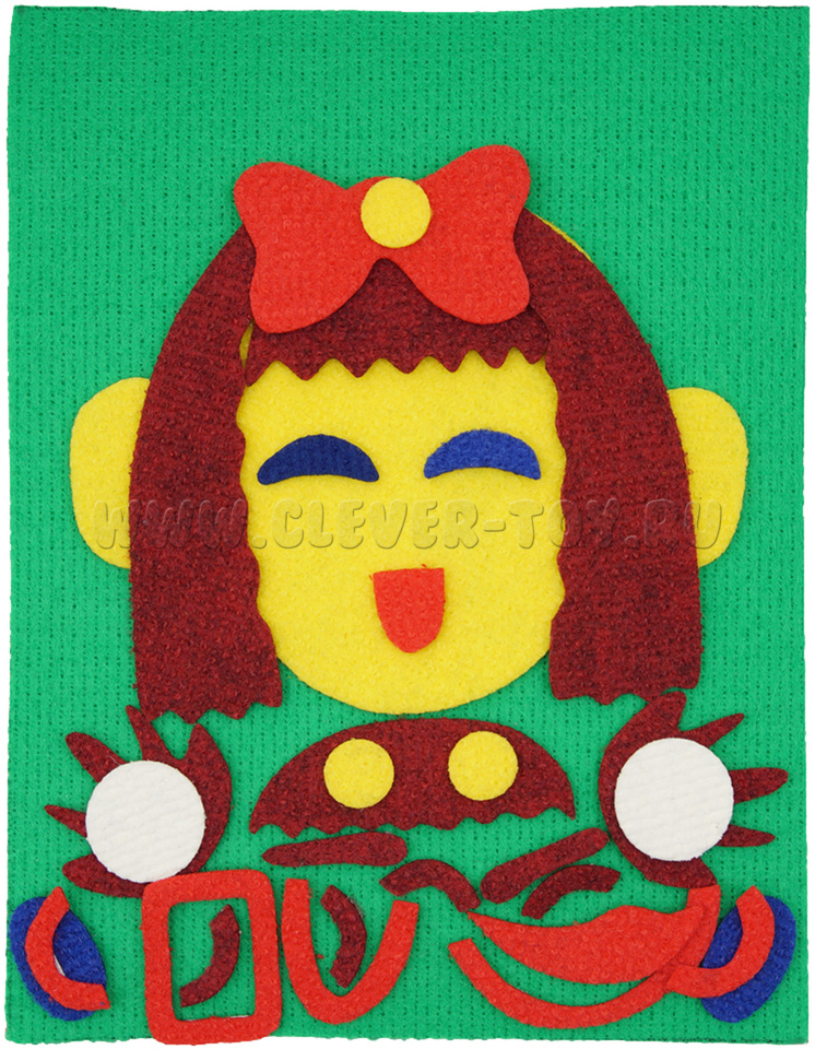 • игровые элементы разных размеров, цветов и форм на многоразовых липучках: овалы лица, уши, губы, волосы, брови, носики, усы, хвостики с бантиками;