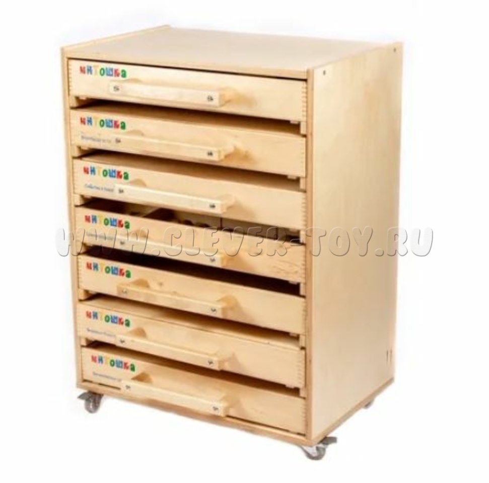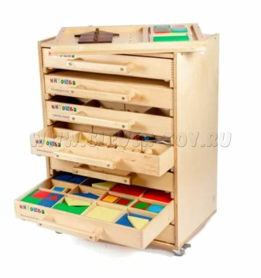 В комплект входит дополнительный ящик с доской-основой и двумя рамками для работы. Все ящики размещаются в мобильном стеллаже. В комплект также входят методические рекомендации.
