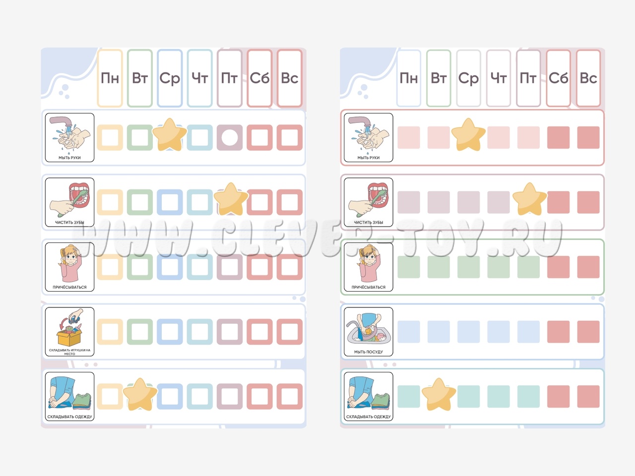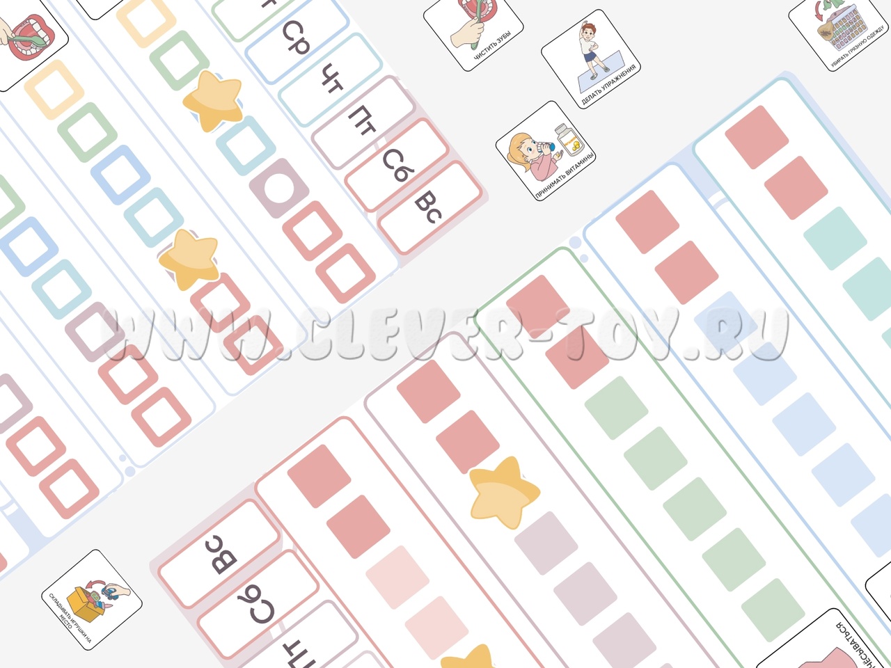Пособие для организации обучения ребенка ежедневным рутинам: чистить зубы, собирать игрушки, собирать портфель и другие. Помогает фиксировать успешность формирования новой привычки и поддерживает мотивацию ребенка. Карточки для мальчика и для девочки.