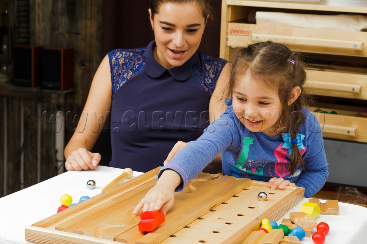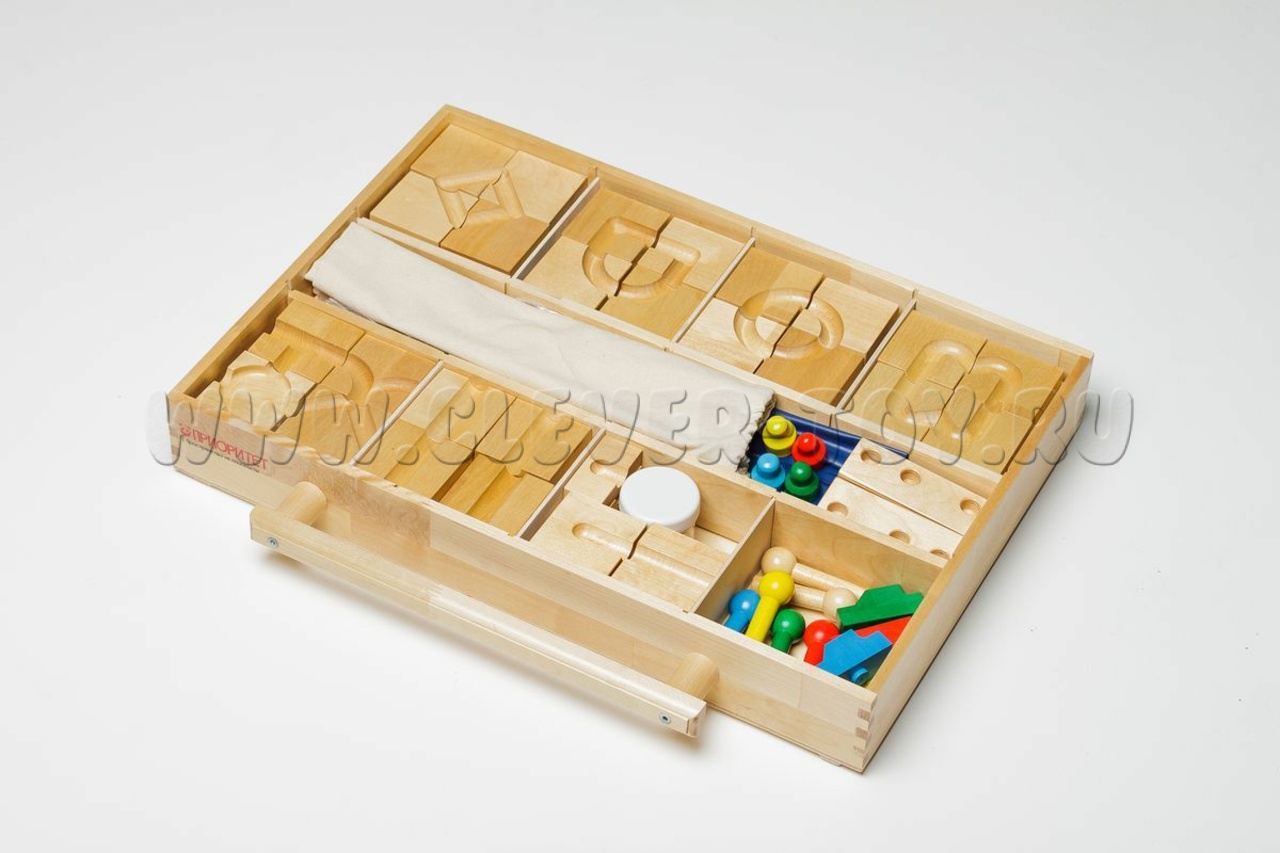 Более 150 деталей: деревянные сегменты-дороги с ложбинками. Ребёнок (или педагог) строит маршрут, катит шарик палочкой-ручкой или ведёт фигурки/машинки до финиша. Развивает координацию, логику, готовит руку к письму.