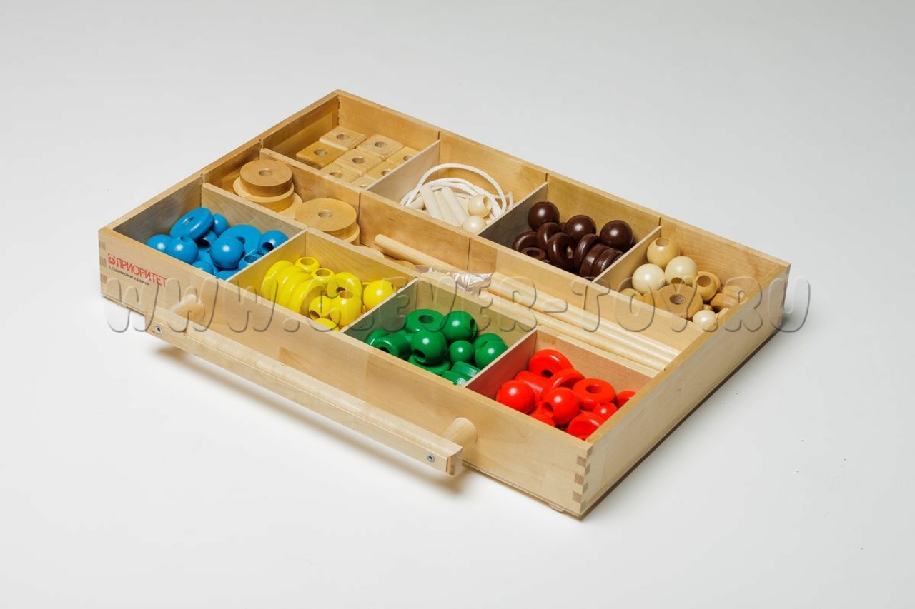 Более 150 деталей: разноцветные бусины с крупными отверстиями, палочки, верёвочки, стержни, подставки, соединительные квадраты. Варианты игр: нанизывание по образцу, сбор пирамид, объёмные конструкции. Развивает воображение, логику, мелкую моторику.