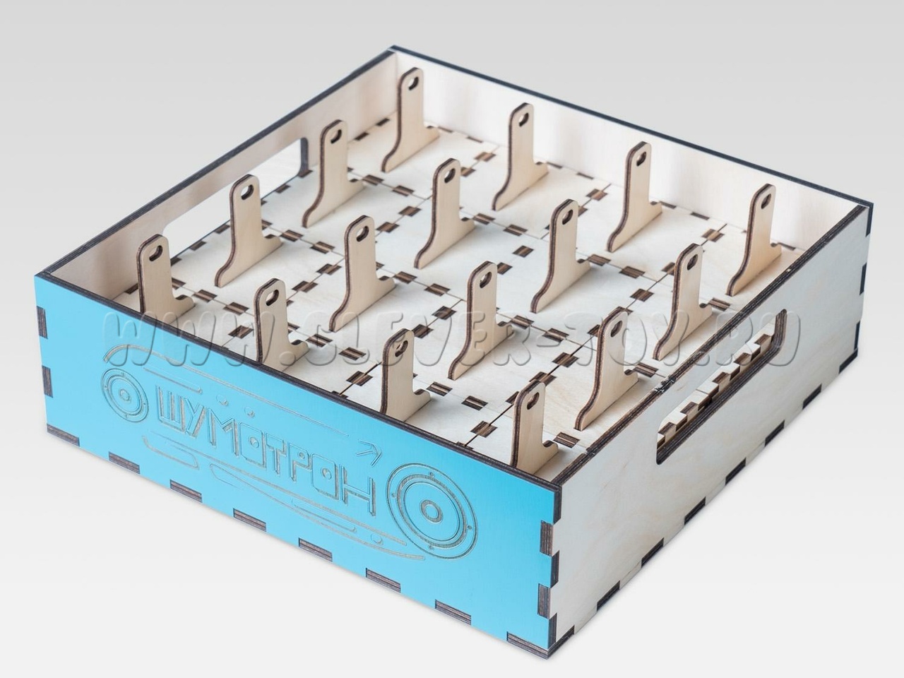Шумовой набор "Шумотрон"  предназначен для использования на занятиях со специалистом-психологом или дефектологом. Набор состоит из ящика и 16 деревянных парных коробочек с восемью различными наполнителями. Каждая коробочка оснащена удобной ручкой с парными отметками для контроля точности выполнения заданий.