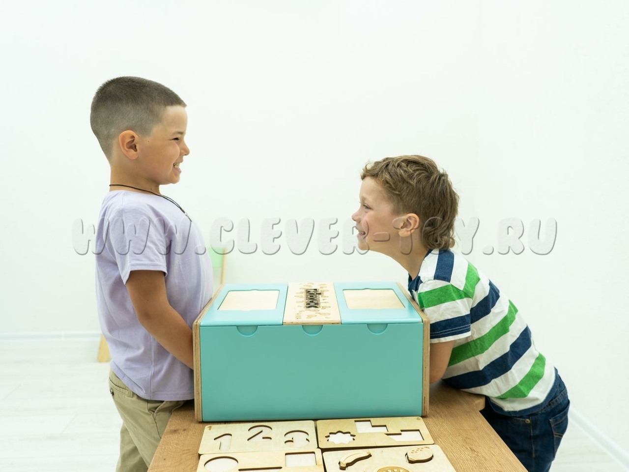 Внутри ящик разделен на две части. Для каждой из них предусмотрено по два углубления для рук. Таким образом, педагог может задействовать сразу несколько детей, давая им разные задания, предлагая одновременно поработать в парах или мини группах.