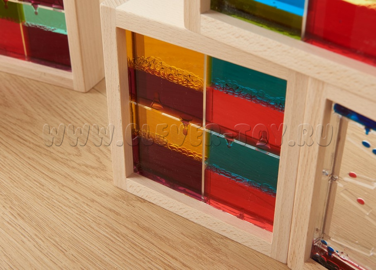 Игровой набор представлен в виде 10 деревянных блоков (6 квадратной формы и 4 прямоугольной формы) с акриловыми стеклами (прозрачными и цветными), заполненными разноцветной жидкостью внутри.
