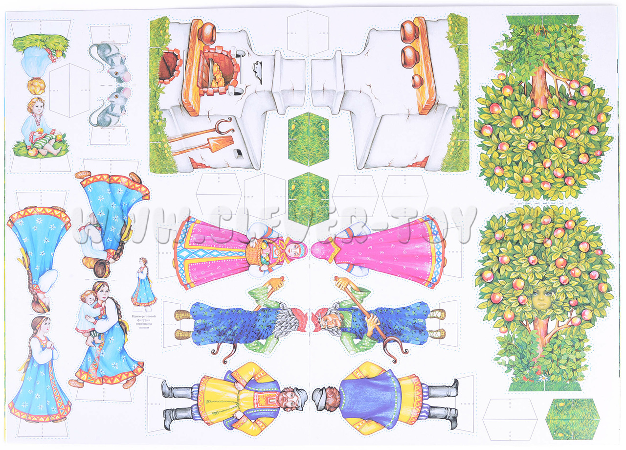 • Действующих персонажей выполненных из плотного картона, созданных для показа настольного театра. Средний размер персонажей, составляет 12 см. (Задача ребенка состоит в том, что нужно вырезать по пунктирным линиям 7 персонажей печку, яблоню, лес, избушку и склеить их);