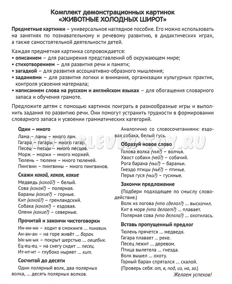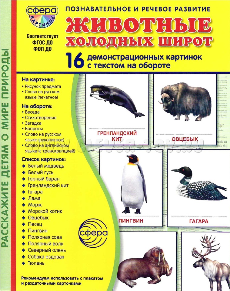 16 демонстрационных картинок для познавательного и речевого развития. На обороте каждой предметной картинки - описание, стихотворение, загадка, вопросы для ребёнка, название на русском и английском языках.