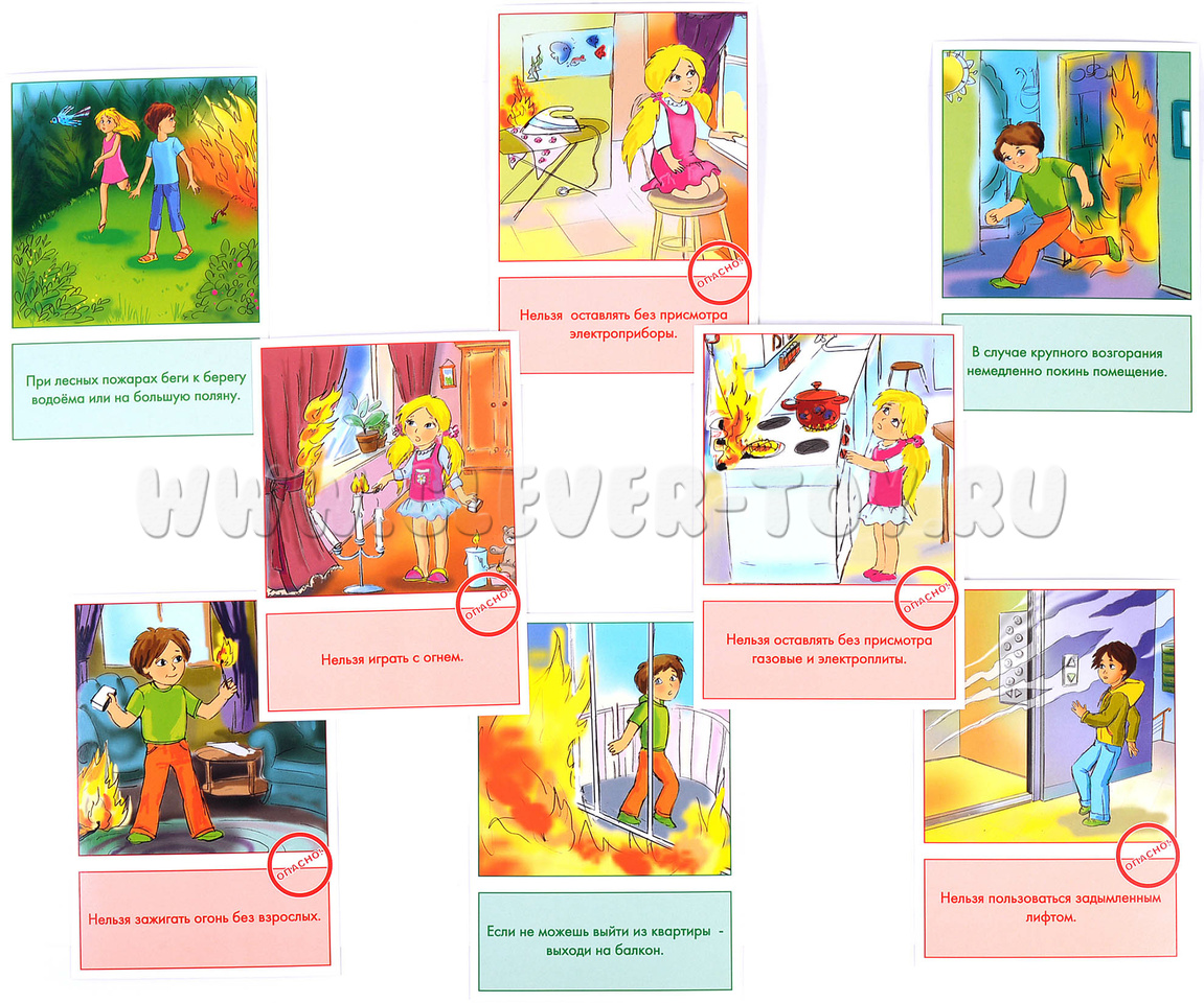 Наглядные карточки от ООО "Маленький гений" познакомят ребёнка с правилами безопасного поведения с огнём: