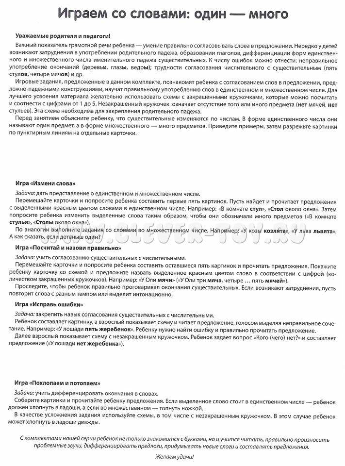 Игровые задания, предложенные в данном комплекте, познакомят ребенка с согласованием слов в предложении, предложно-падежными конструкциями, научат правильному употреблению слов в единственном и множественном числе.