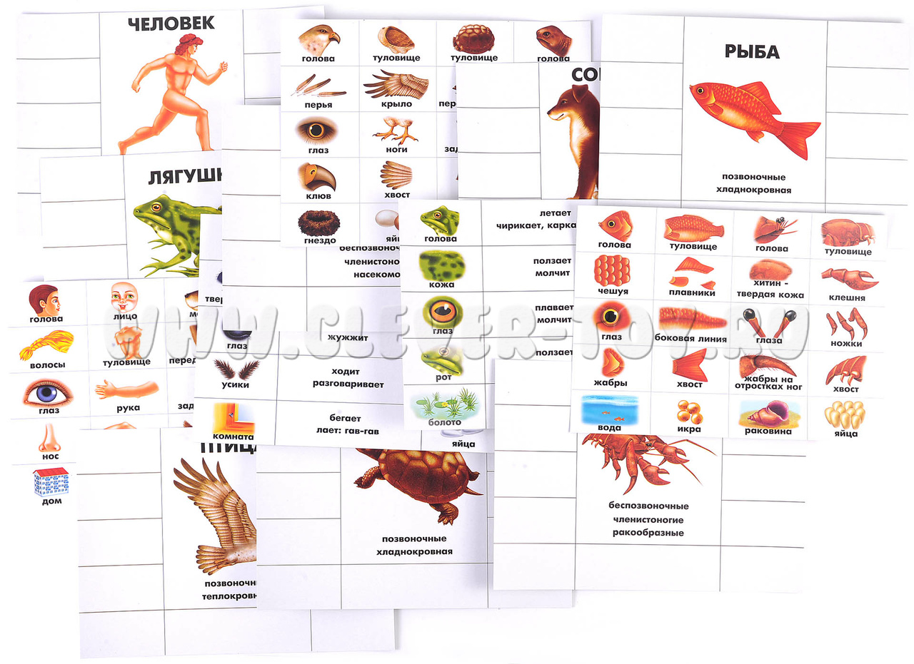 - Ведущий показывает маленькие карточки с частями тел, а дети смотрят, подходят ли они их животному. Кто первым правильно закроет большую карту, тот и выигрывает.