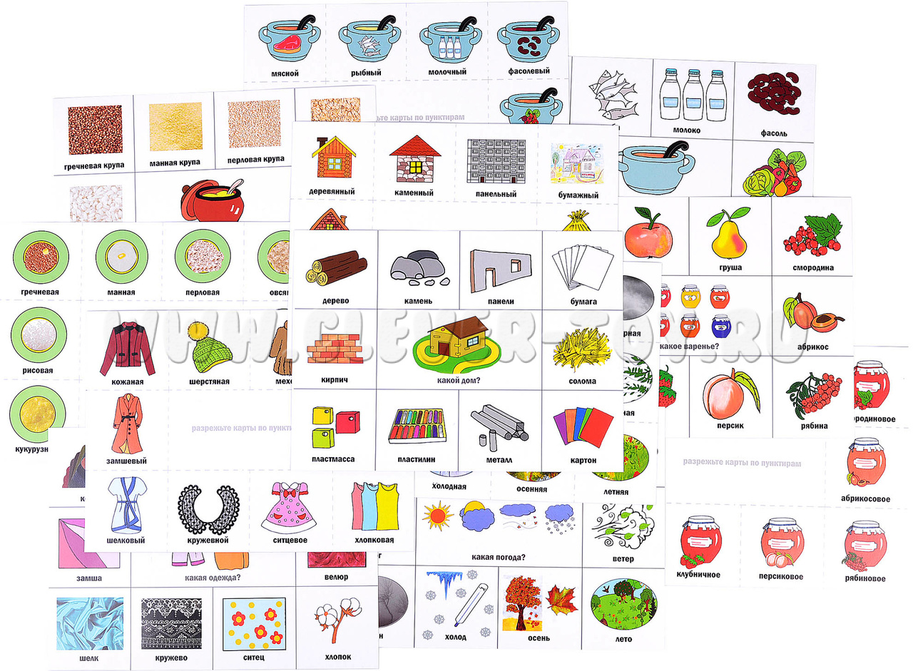 Игра включает в себя 7 лексических тем: "фрукты" и "овощи", "ягоды", "продукты", "дом" и "одежда", "времена года. поггода". В составе набора 6 игровых полей и 60 разрезных карточек с предметами, относящихся к одной лексической теме.