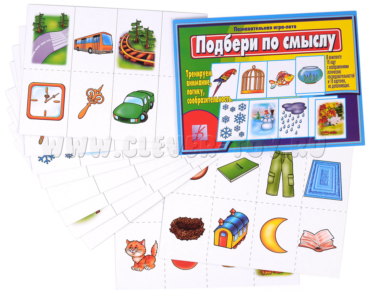 В наборе папка для хранения и 10 карт: 16 неоконченных смысловых цепочек и 16 картинок-окончаний. Перед началом игры разрежьте карты по пунктирным линиям. Предложите малышу найти закономерность и подобрать подходящую к цепочке картинку, выложив ее на пустую клетку карты. Попросите ребенка аргументировать свой выбор.