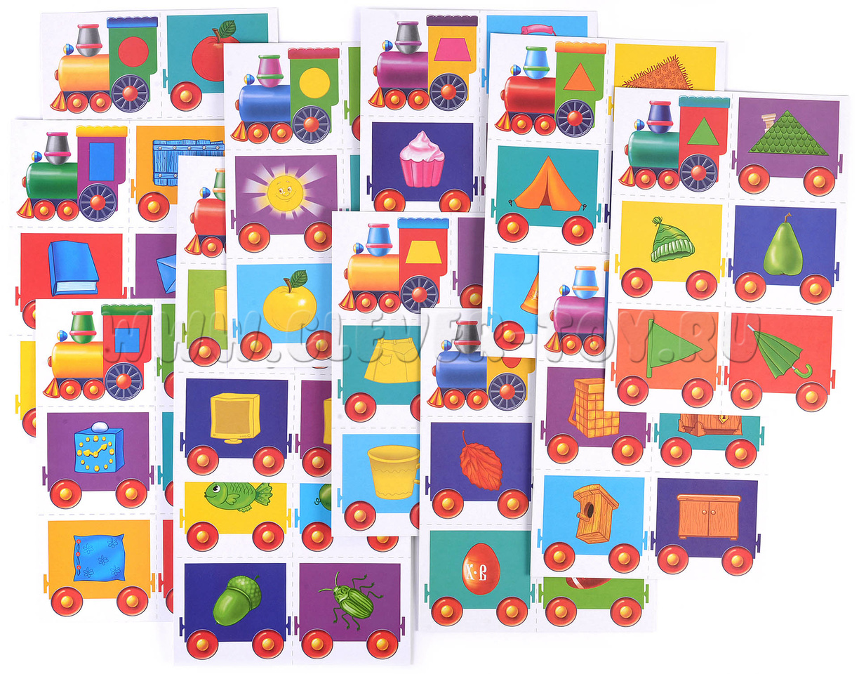 В комплекте 72 карточки с изображением вагончиков, логически связанных между собой.