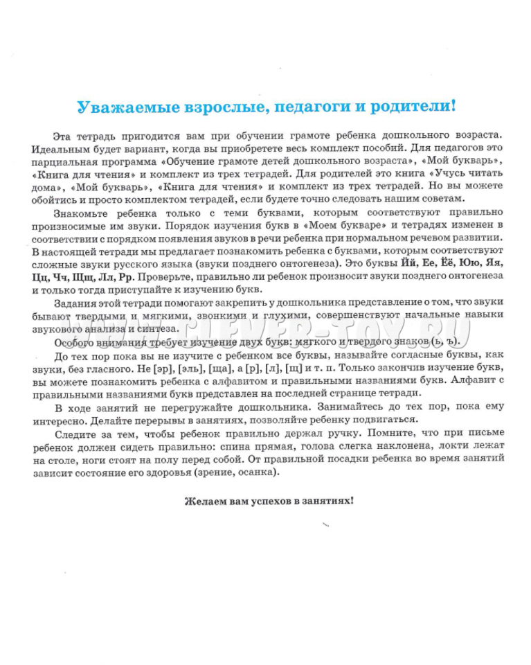 Тетрадь познакомит малышей со звуками, их местом в слове, поможет развить мелкую моторику и освоить начертание основных элементов, входящих в состав букв, букв по отдельности и в составе слова, поспособствует привыканию к тетрадной разметке в клетку.