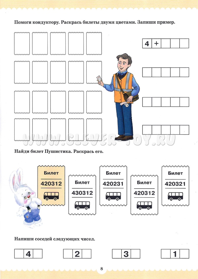 Вместе со сказочными персонажами Рыжиком и Пушистиком малыши, познакомятся с людьми разных профессий, закрепят знания цифр, вспомнят их последовательность в числовом ряду, познакомятся с составом чисел из двух меньших, узнают про сложение и вычитание, про математические знаки, научатся решать простые задачки, писать цифры.