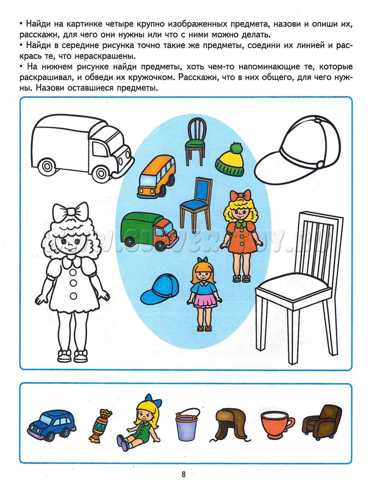 Развитие речи ребенка является одним из самых сложных элементов его деятельности, поэтому при выполнении заданий не торопите ребенка. В случае затруднения в произношении слов или описании предметов произносите или расскажите сами, четко проговаривая каждое слово, а затем попросите ребенка повторить сказанное.