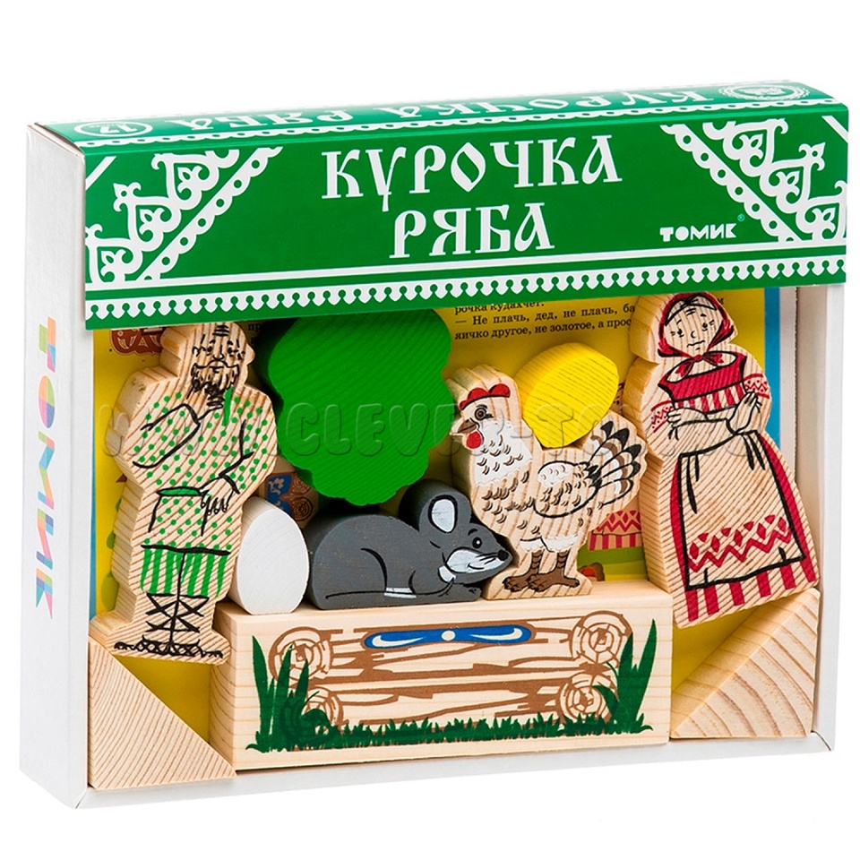 В набор входят деревянные модели персонажей и декорации сказки "Курочка Ряба" (всего 17 деталей).