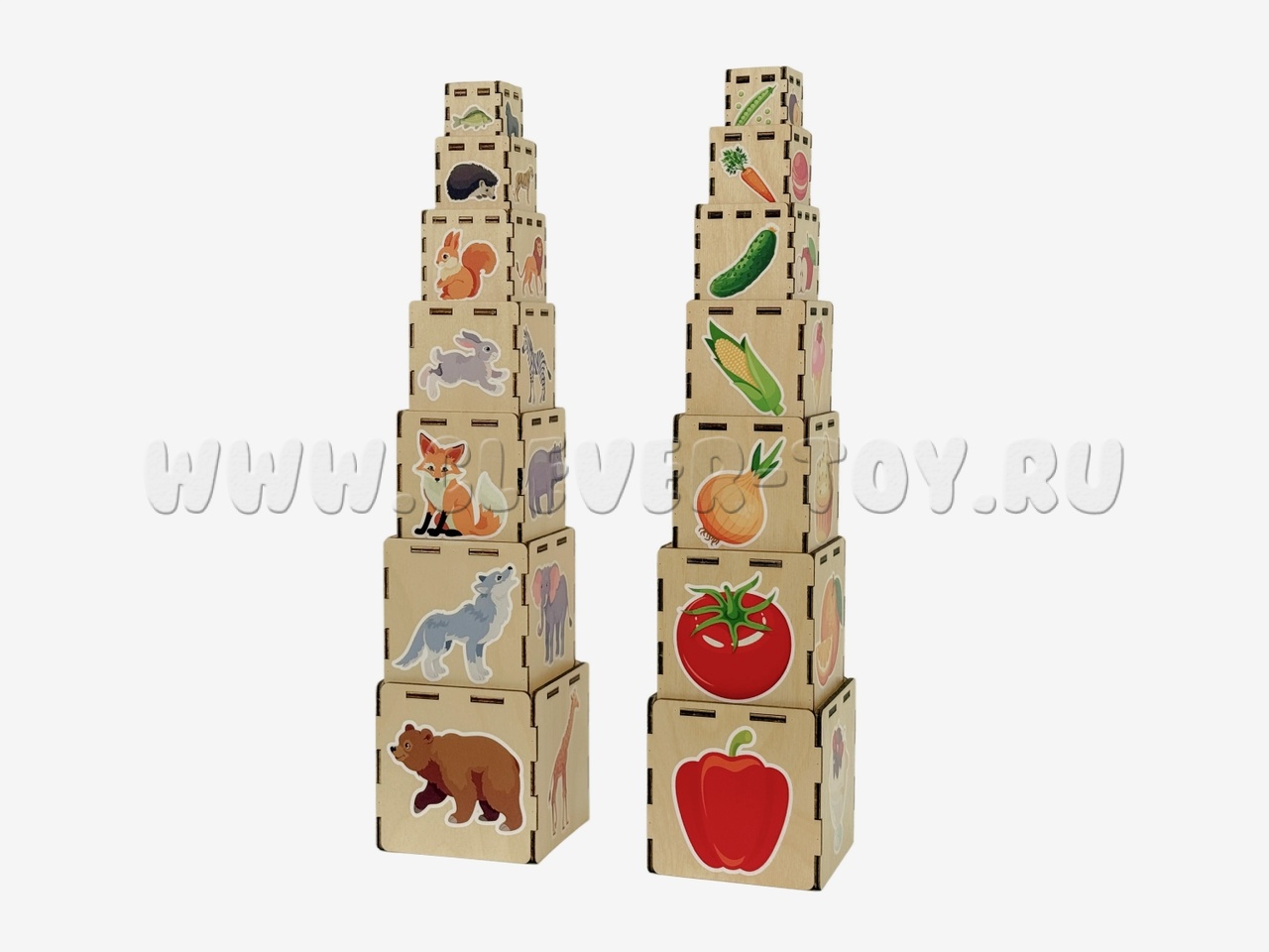 Кубики выполнены из прочной березовой фанеры. Изображения нанесены методом УФ-печати стойкими к выцветанию красками и покрыты лаком. Закругленные края исключают риск травмирования во время игры. Благодаря устойчивому основанию конструкция пирамиды надежно стоит на месте. Кубики складываются друг в друга, поэтому они не занимают много места при хранении.