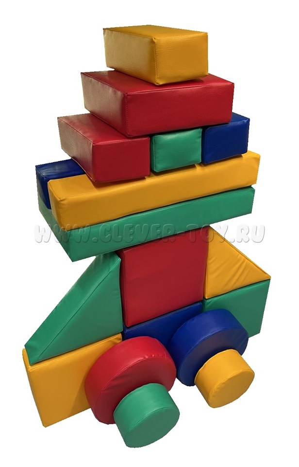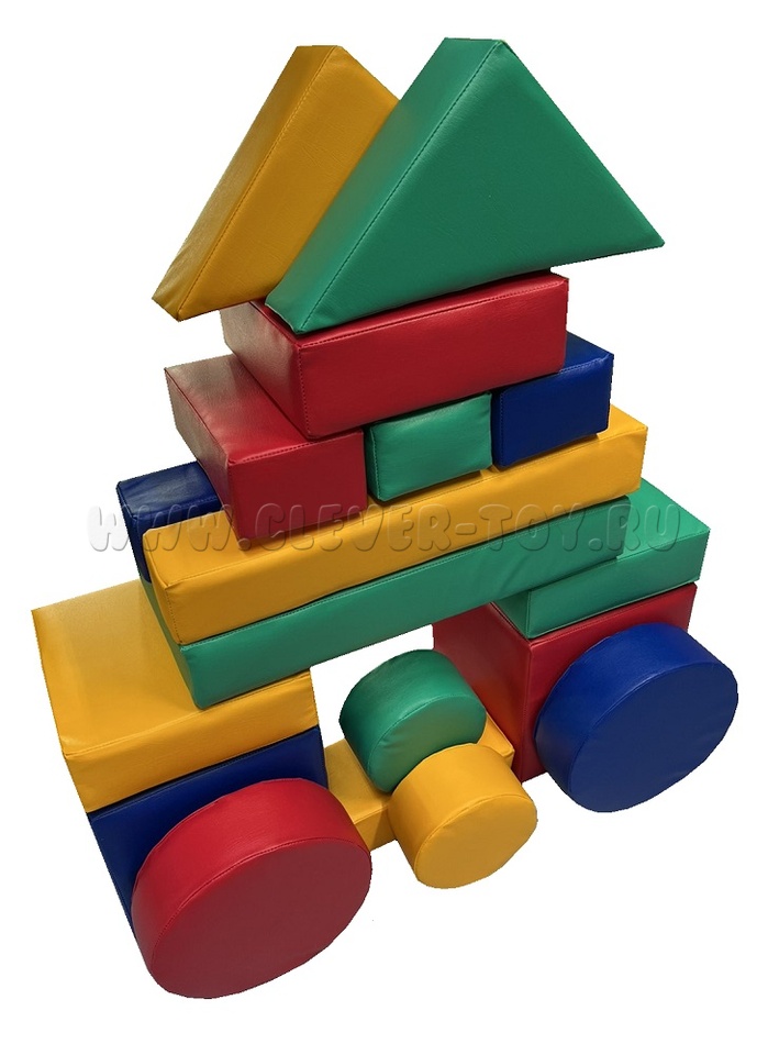 Комплектация: куб 30*30*30 - 2 шт. прямоугольник 60*30*10 - 1шт. круг D30*H10 - 2шт. круг D20*H10 - 2шт. прямоугольник 30*15*10 - 4шт. треугольник 30*30*10 - 2шт. квадрат 30*30*10 - 3шт. брус 60*10*10 - 2шт.