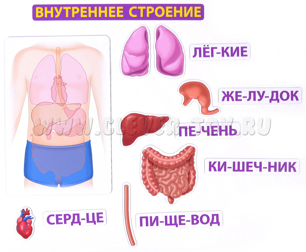 В наборе 88 магнитных карточек трёх видов: плакаты с изображением тела или его частей (сами служат магнитной основой); названия, разбитые по слогам; внутренние органы (знакомим с ними постепенно, по возрасту).