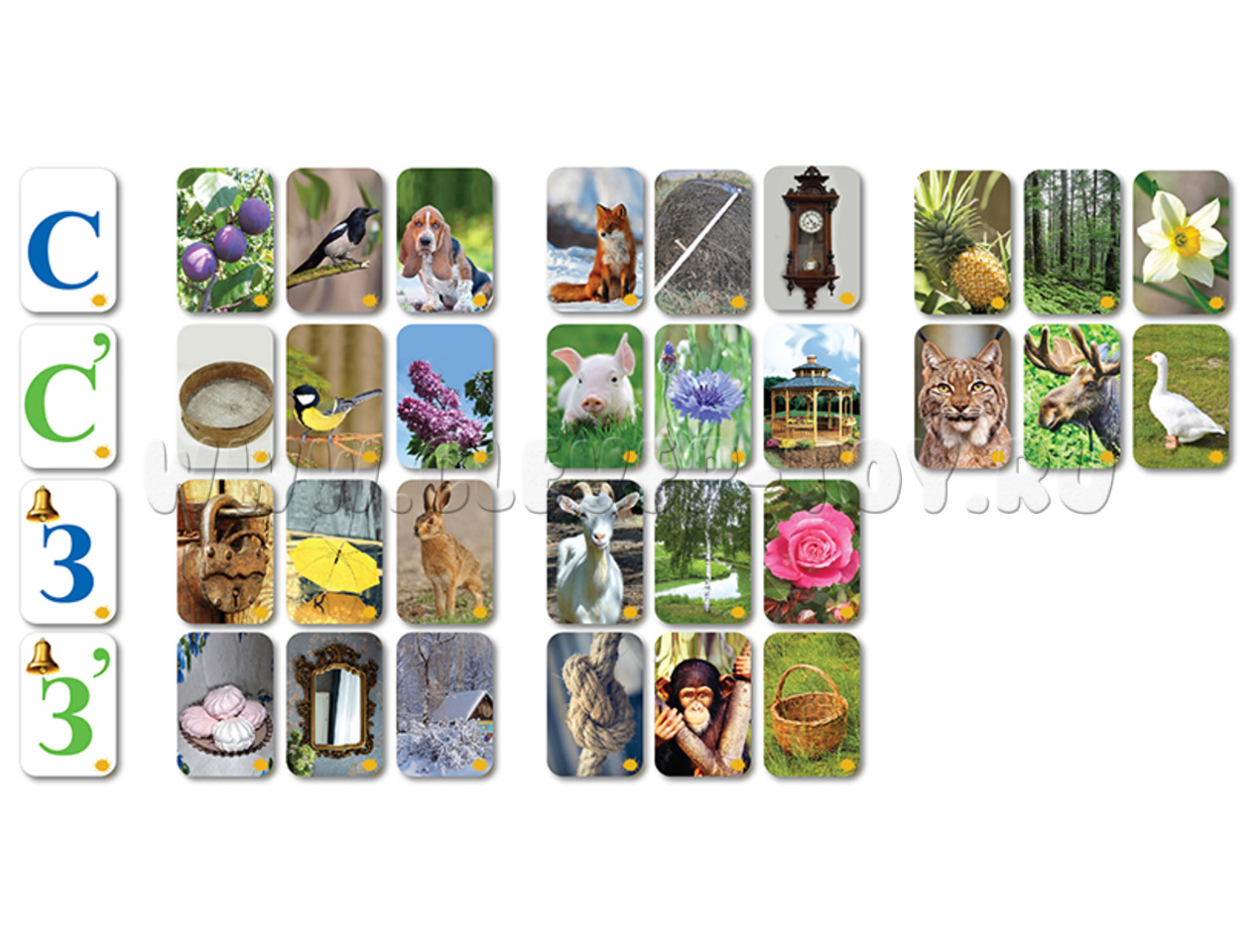 З, С, З’, С’ – Замок, Зонт, Заяц, коЗа, берёЗа, роЗа; Слива, Сорока, Собака, лиСа, коСа, чаСы, ананаС, леС, нарцисС; Зефир, Зеркало, Зима, уЗел, обеЗьяна, корЗина; Сито, Синица, Сирень, пороСёнок, ваСилёк, беСедка, рыСь, лоСь, гуСь.