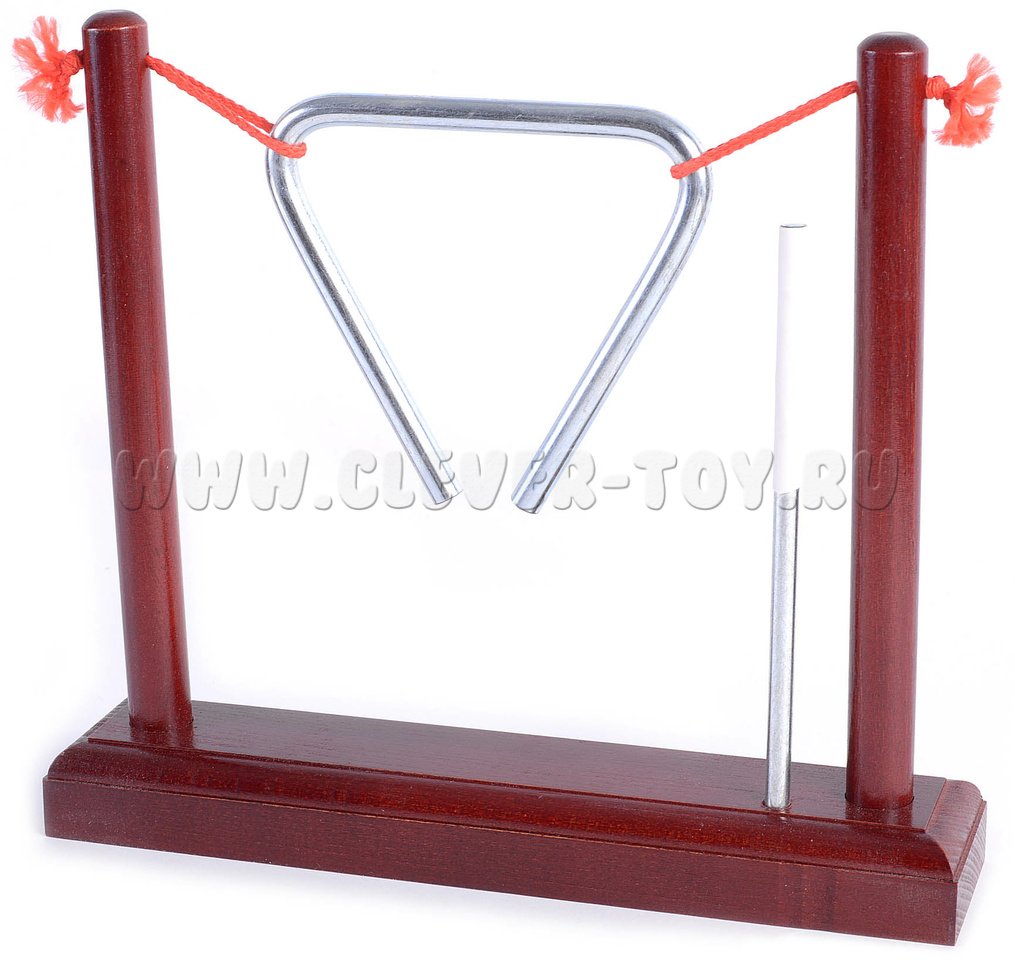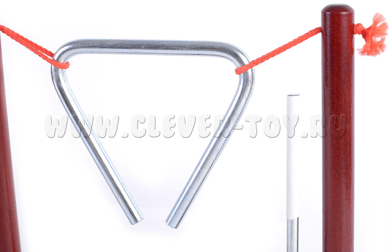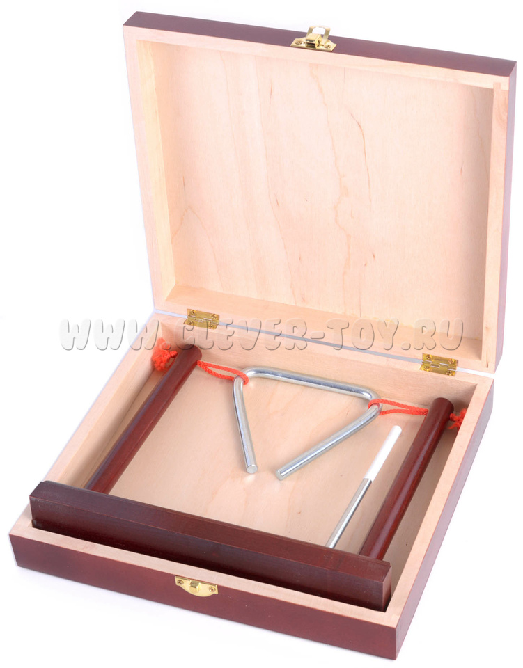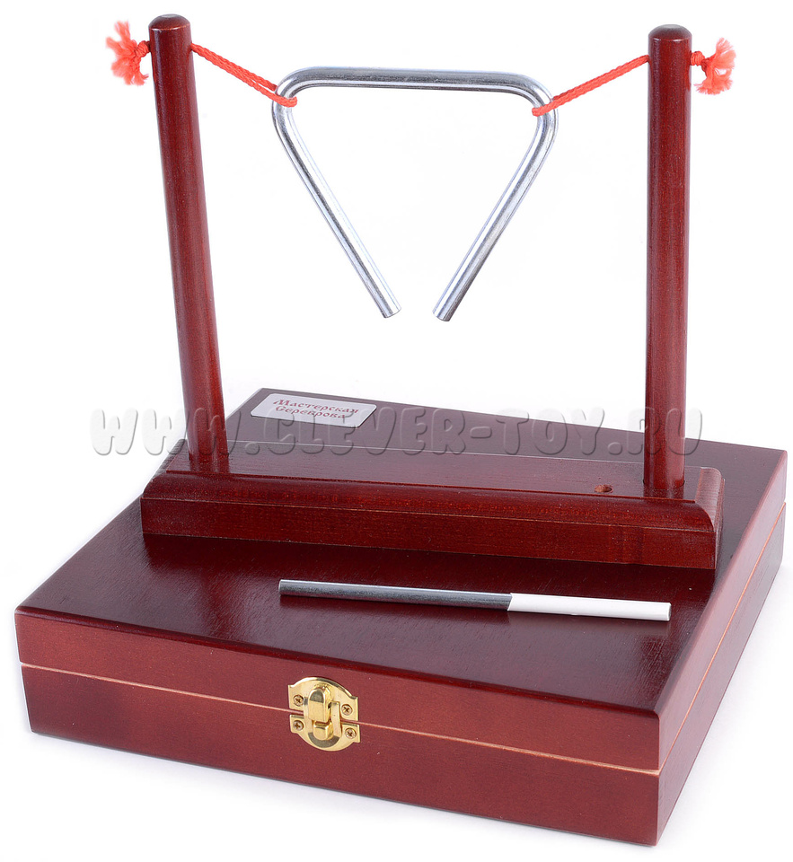 Треугольник выполнен из стали диаметром 8мм, длина стороны - 10см. Гальваническое покрытие не ухудшает качество звука и не разрушается при механическом воздействии. Треугольник закреплен на деревянном основании. Ударная палочка из нержавеющей стали. Подарочный кейс с золочеными застежками.