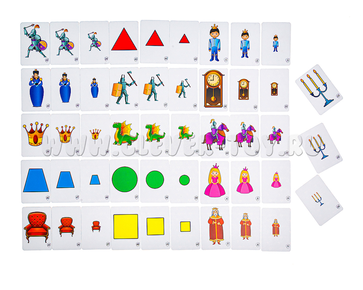 - Игра «Замковый бой». Все карточки делятся между игроками. Каждый игрок складывает свои карты стопкой лицевой стороной вверх. Игроки одновременно выкладывают верхнюю карту своей стопки. Игрок, выложивший карточку с самым большим изображением, забирает себе все карты…