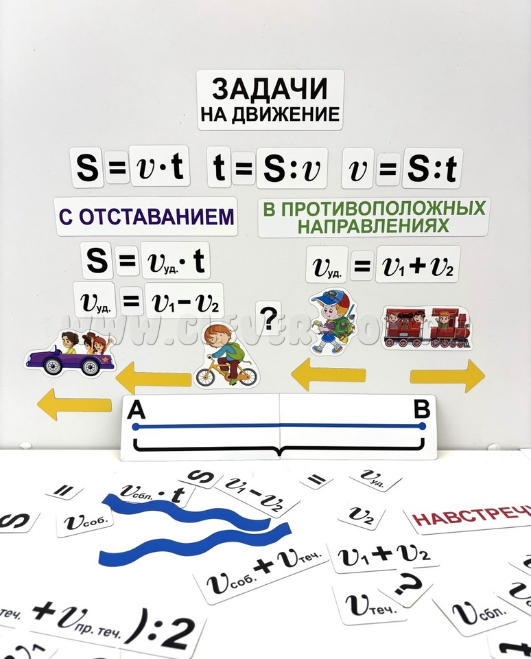 В наборе представлены разнообразные элементы для визуализации задач. Есть карточки с формулами, охватывающими основные типы движения: навстречу друг другу, вдогонку, в противоположных направлениях, с отставанием, а также движение по реке. Для наглядности включены имитация реки и отрезок дороги от пункта А до пункта В.