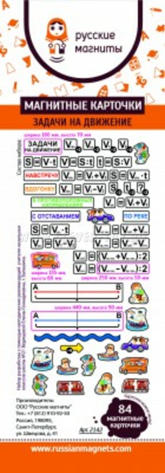 Набор магнитных карточек "Задачи на движение" призван помочь педагогам просто и наглядно объяснять школьникам сложные темы, связанные с движением объектов. В комплекте - 83 гибкие магнитные карточки, которые не ломаются при сгибании, не расслаиваются по краям и допускают мытьё с мылом.