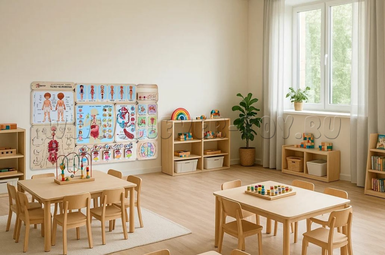 Дидактическая панель "Тело человека" знакомит детей дошкольного возраста с устройством человеческого организма. Наглядно демонстрирует, из каких частей, внутренних органов и систем состоит тело, даёт представление о пяти чувствах, работе мозга, а также объясняет процессы пищеварения и циркуляции крови.